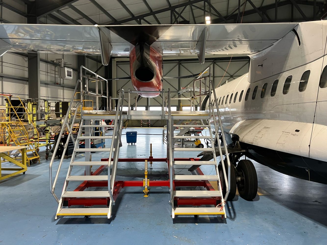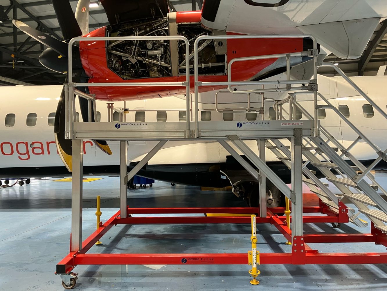 The Semmco ATR Platform is designed to provide safe, stable and efficient access to the engines and maintenance areas of ATR 42-600 and ATR 72-600 aircraft. Built for professional aircraft maintenance environments, the platform allows technicians to easily access both the left and right ATR engines, with an additional “HOP-UP” step providing enhanced reach and full working access around the aircraft.